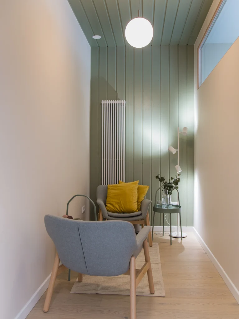 Przestrzeń została zaprojektowana z myślą o funkcjonalności i elastyczności. Gabinety psychologiczne są kameralne, wyposażone w wygodne fotele i stoliki, co sprzyja swobodnej rozmowie. Sala warsztatowa jest przestronna i modułowa, co pozwala na różnorodne aranżacje w zależności od potrzeb – od warsztatów po grupowe sesje terapeutyczne. Dbałość o detale, takie jak odpowiednie oświetlenie czy akustyka, zapewnia komfort i spokój.
