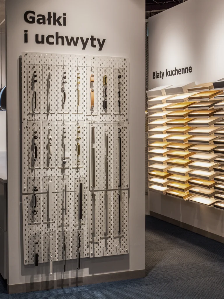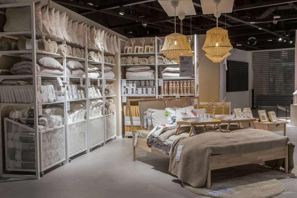 Wnętrze sklepu odzwierciedla charakterystyczny dla IKEA minimalizm, łącząc jasne, neutralne barwy z naturalnymi materiałami. Dominują biele, szarości i ciepłe odcienie drewna, które tworzą przyjazną i inspirującą atmosferę. Wykorzystanie materiałów takich jak sklejka podkreśla ekologiczne podejście marki i wprowadza elementy przytulności do przestrzeni handlowej.