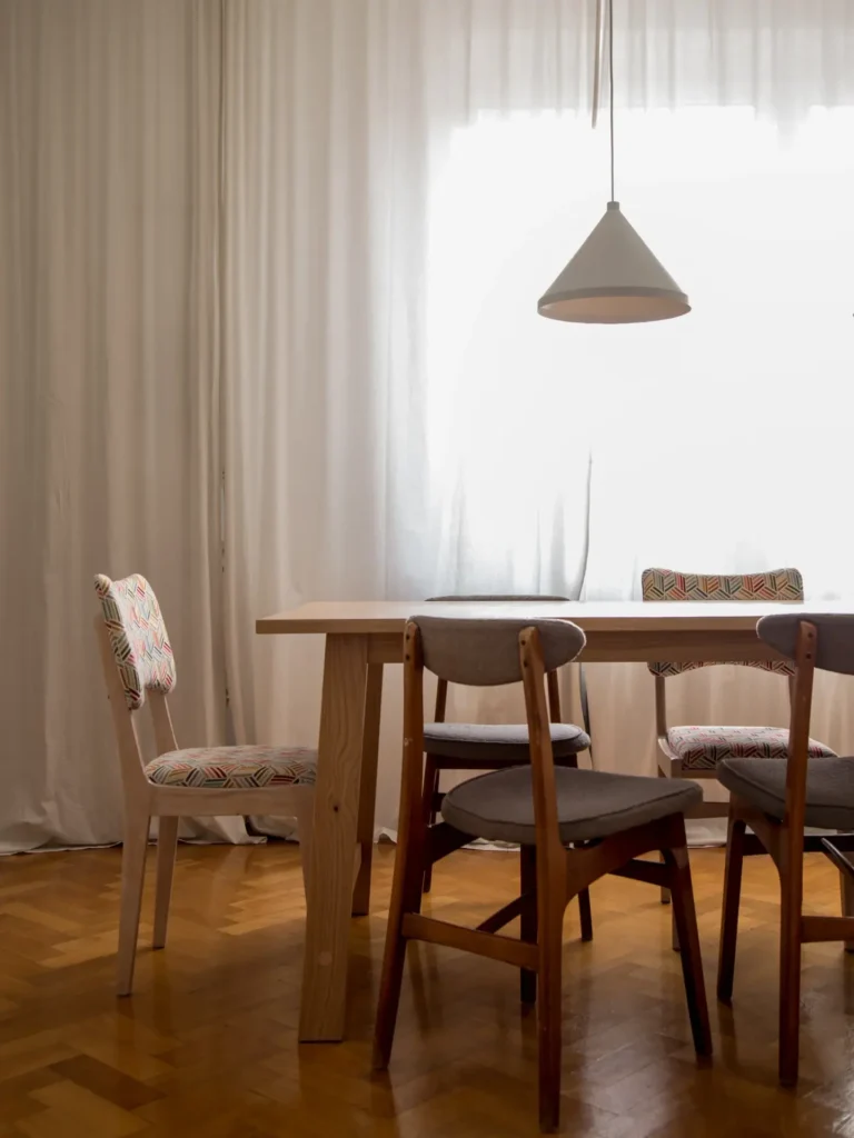 Strefy odpoczynku są głębsze, bardziej nastrojowe, a przestrzenie dzienne jasne i lekkie. Dawny blask przywrócony wyjątkowym elementom historii tego miejsca, to klucz tego projektu – piękny, mosiężny żyrandol z lat 70-tych rozbłysł na nowo, a krzesła odnalezione na strychu, będące perełkami PRL-owskiego wzornictwa, zapraszają świeżą tapicerką i nowym lakierem. Wśród nich znalazły się dwa kultowe projekty autorstwa R.T. Hałasa – typ 200-190 oraz krzesło 296, znane jako “motylek”.
