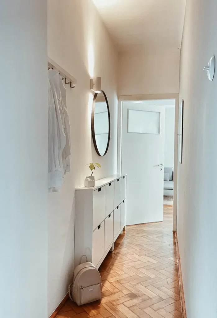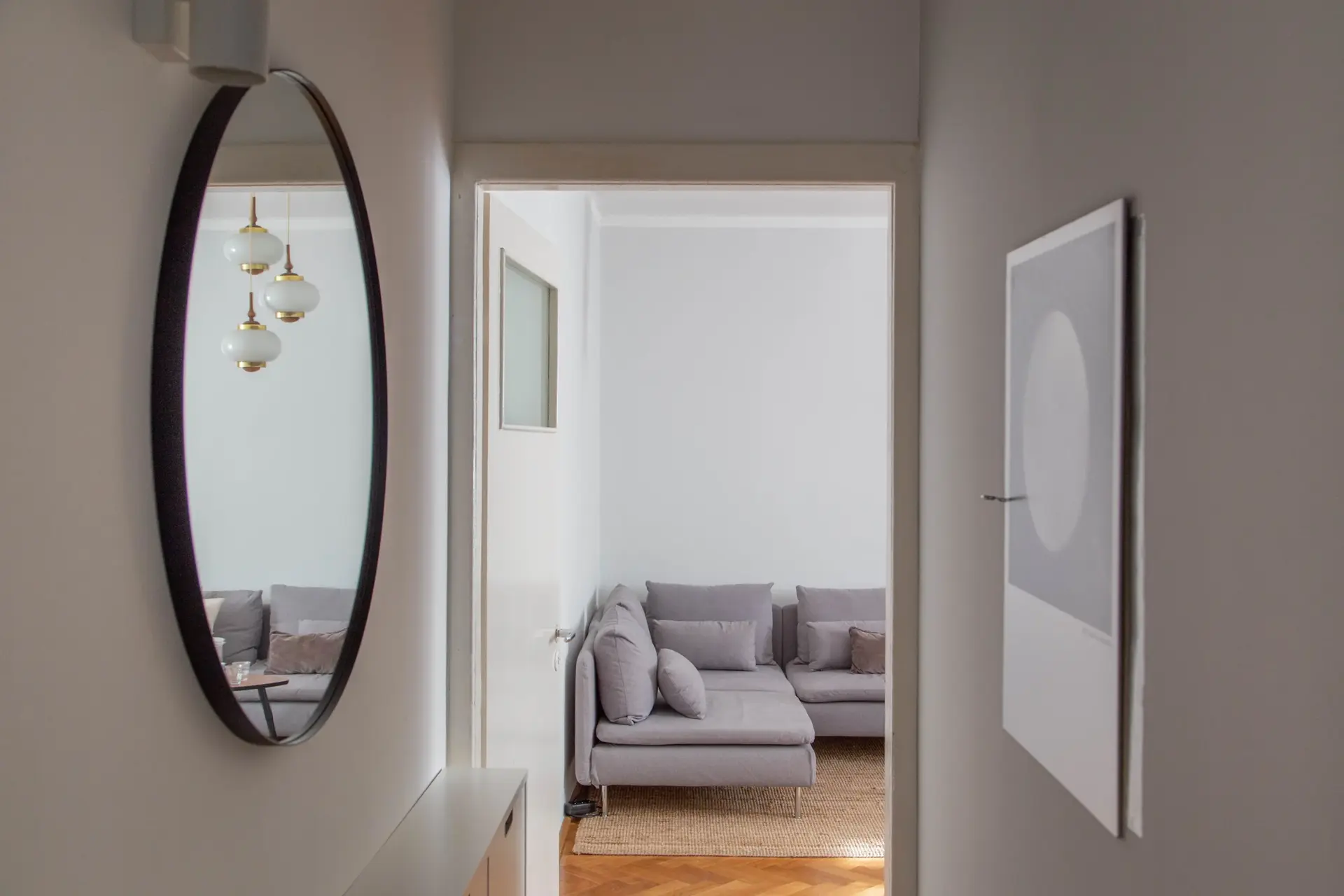 Mieszkanie, choć zaprojektowane według prawideł minimalizmu, nawiązuje do modernistycznej estetyki i francuskiej uważności na detale. Kluczowym założeniem było zachowanie autentyczności miejsca – odnowiona, drewniana podłoga stała się podstawą projektu, łącząc przeszłość z teraźniejszością. Jej naturalna barwa doskonale komplementuje ustaloną paletę kolorów, nadając wnętrzu przytulności i charakteru. Delikatna, stonowana szarość płynie między ścianami i meblami, nadając wnętrzu atmosferę wyciszenia i harmonii, jednocześnie dodając odrobiny francuskiego szyku.