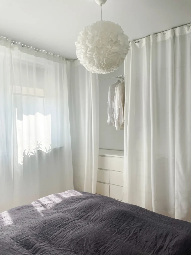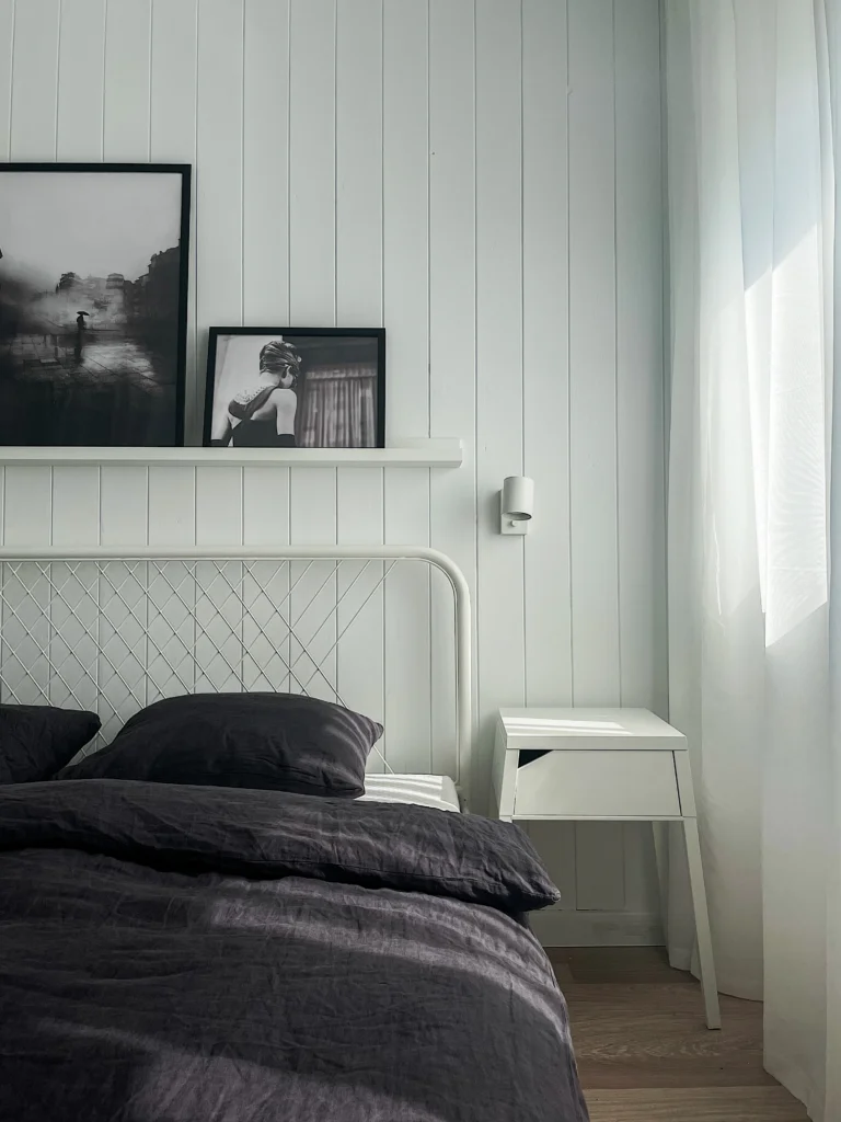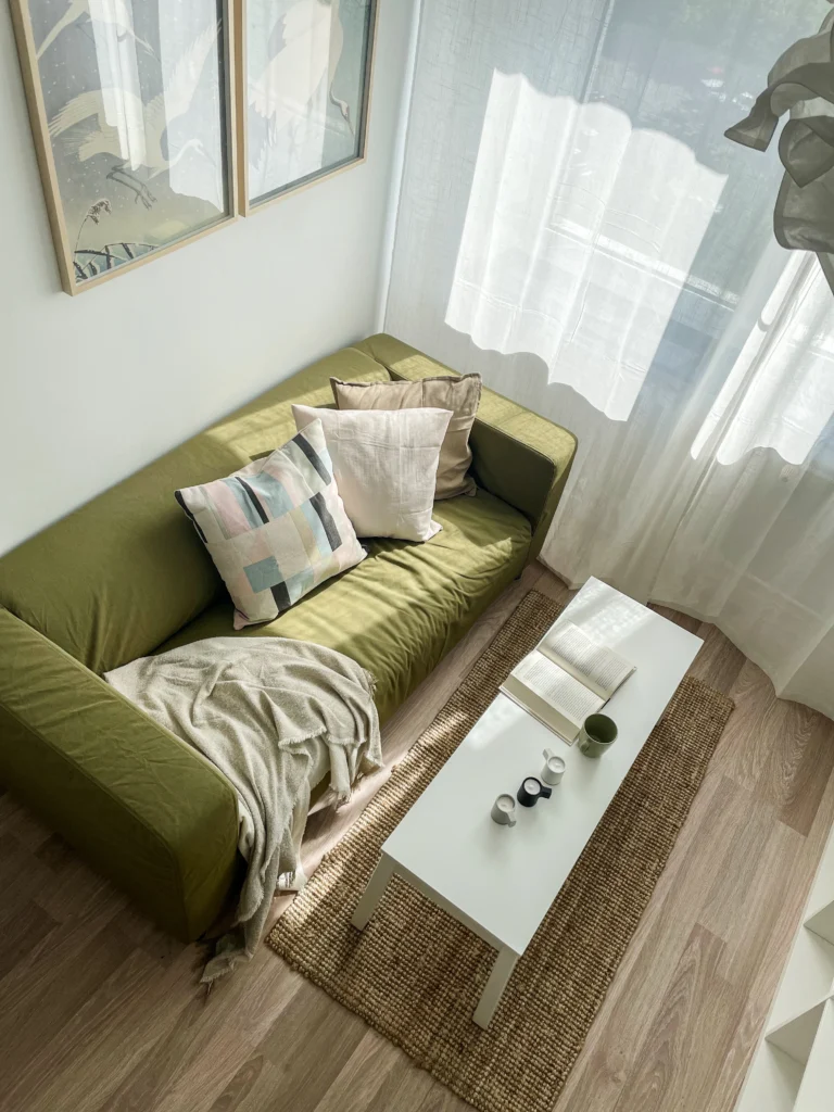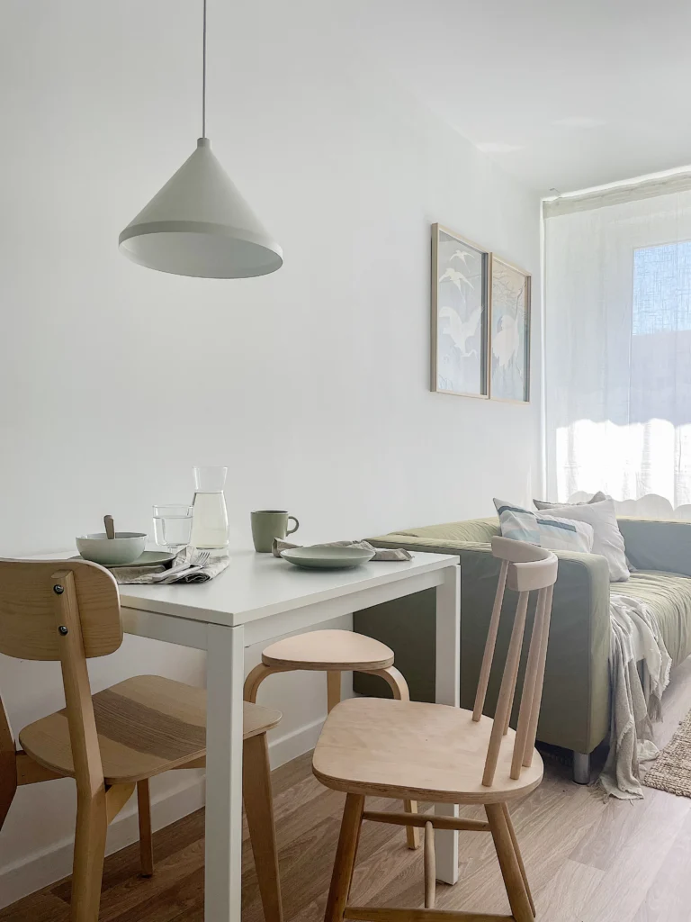Projekt został zaplanowany z myślą o maksymalnym wykorzystaniu każdego centymetra – zabudowa kuchenna sięga aż do sufitu, oferując dodatkowe miejsce do przechowywania, a meble w części dziennej są wielofunkcyjne, pozwalając na elastyczne użytkowanie przestrzeni. Wnętrze pozostaje minimalistyczne, ale nie surowe – zmysłowe tkaniny, miękkie światło lamp i detale w postaci ceramicznych naczyń czy drewnianych dodatków sprawiają, że mieszkanie jest nie tylko praktyczne, ale także przyjemne w odbiorze.
