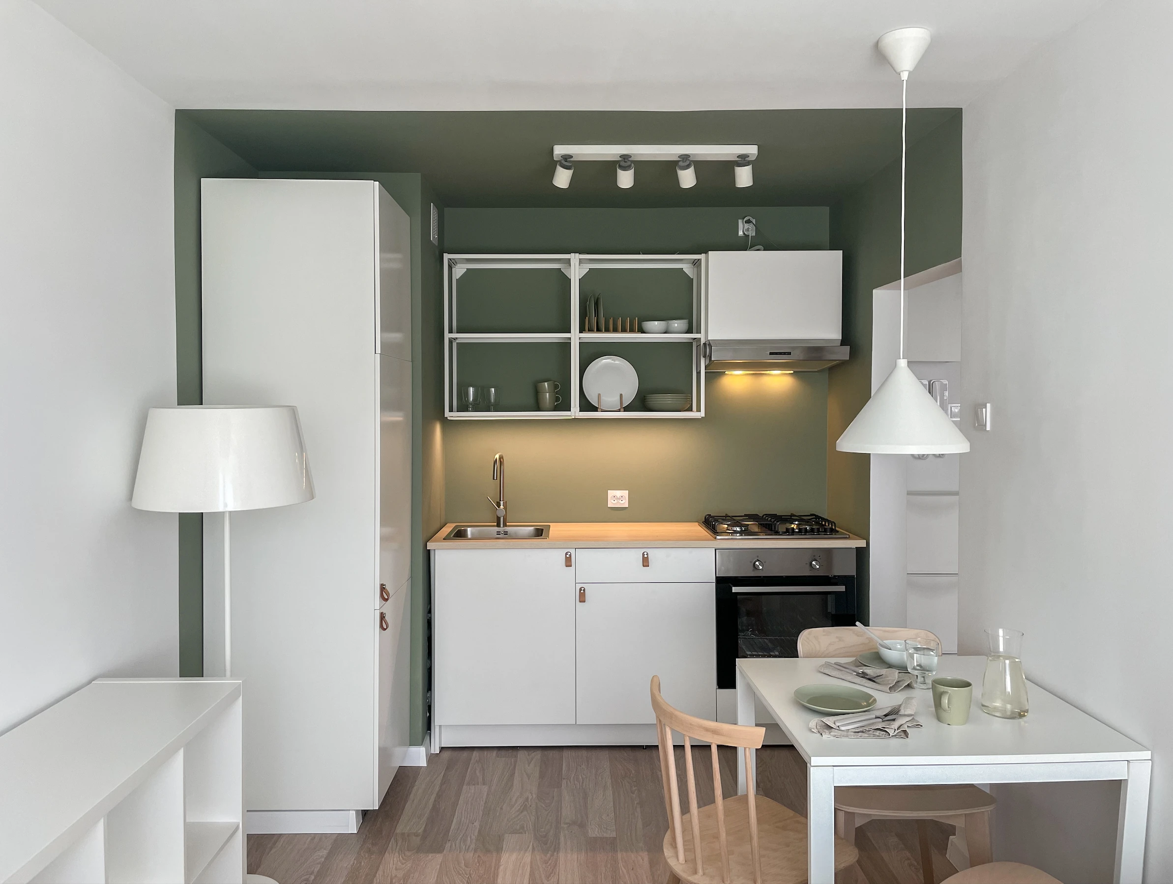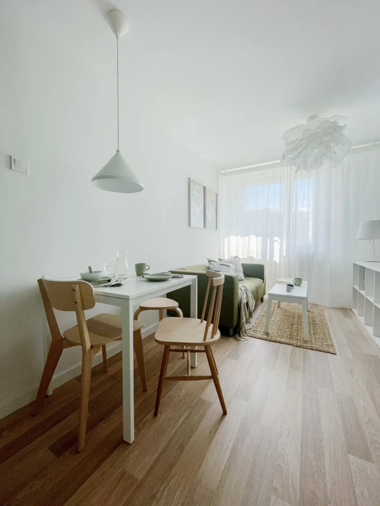 Wnętrze, mimo swojej prostoty, jest pełne subtelnych kontrastów – matowe, białe fronty kuchenne zestawione są z zielonymi ścianami i naturalnym odcieniem drewnianej podłogi, które dodaje przestrzeni przytulności. Minimalistyczne rozwiązania sprawiają, że mieszkanie zachowuje swoją estetykę nawet przy intensywnym użytkowaniu. Aby optycznie powiększyć przestrzeń, zastosowano spójne materiały i jasną bazę kolorystyczną. Białe i beżowe akcenty odbijają światło, a duże, proste powierzchnie nadają wnętrzu lekkości. Dzięki temu kawalerka wydaje się większa, niż faktycznie jest.