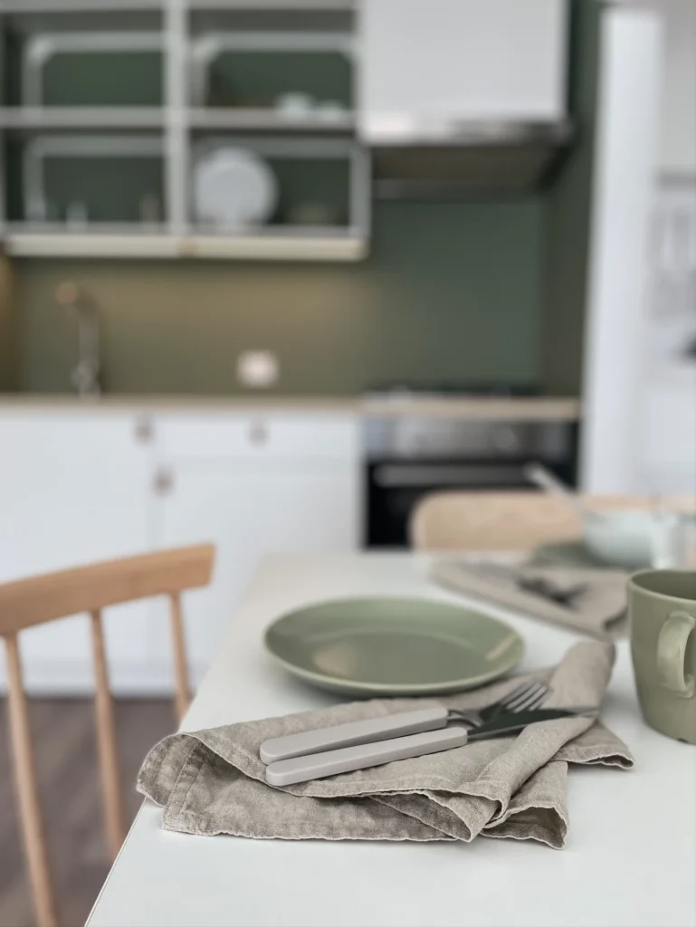 Zieleń to kolor, który działa na zmysły w niezwykle subtelny sposób – odpręża, uspokaja i przywraca równowagę. W tym projekcie pełni również rolę organizacyjną – wydzielona kuchnia, zamknięta w głębokim nasyceniu, wyraźnie oddziela się od strefy dziennej, nadając wnętrzu struktury i rytmu.